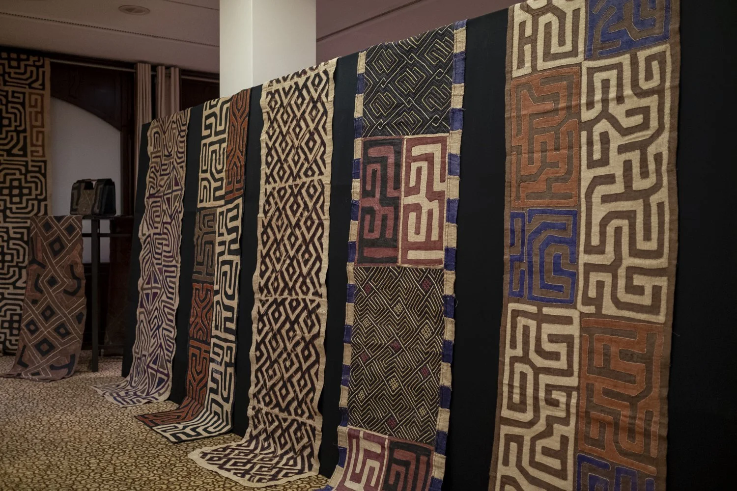 Kuba cloth also known as Velvet tapestry or Shoowa are hand-woven into complex geometric patterns using the strands from raffia palm leaves. The raffia strands are dyed in a variety of earth tones using vegetables dyes. These textiles are unique in the region of Kasaï, in the Democratic Republic of the Congo.